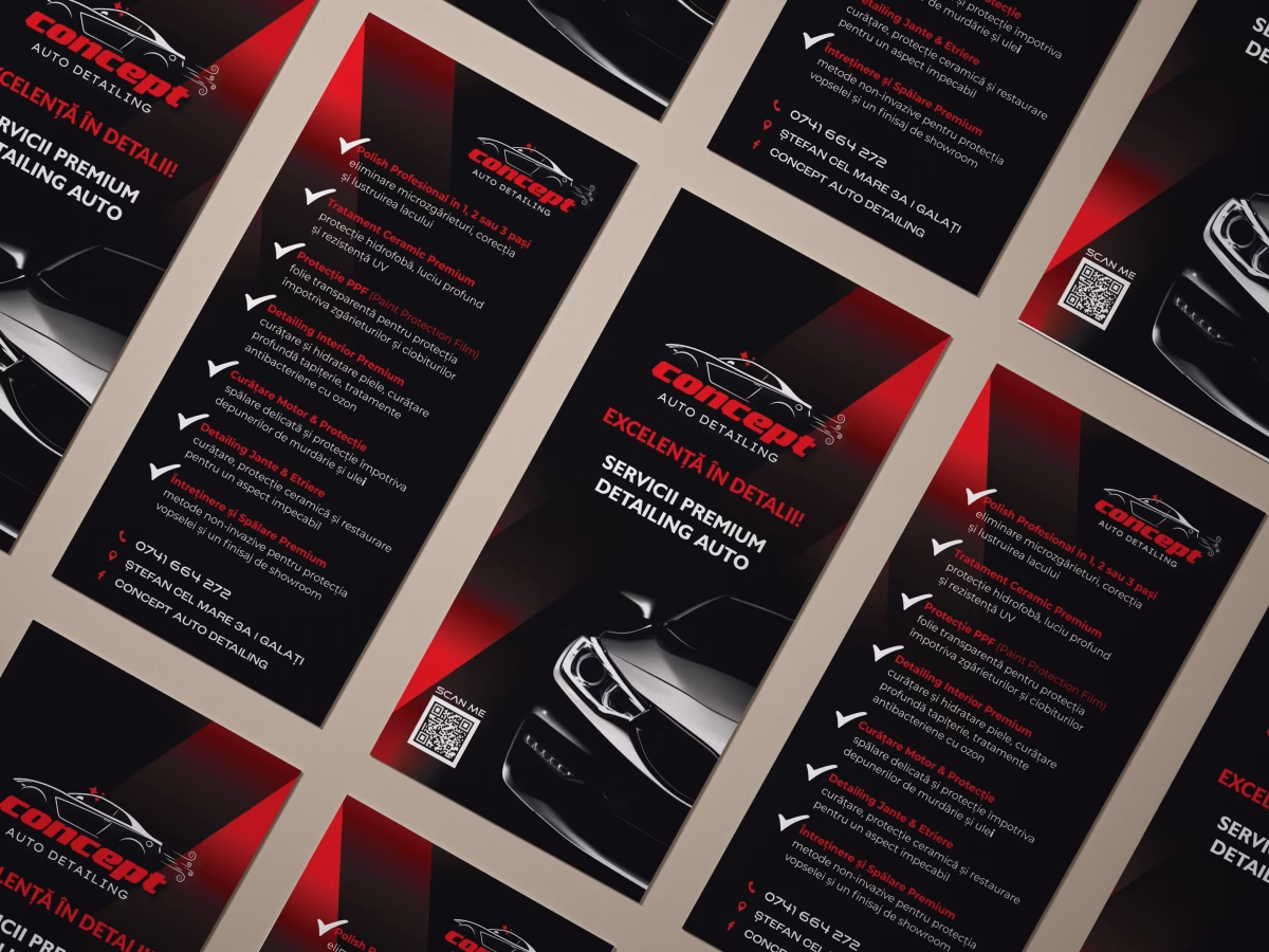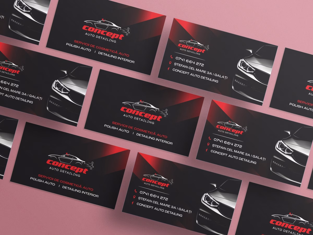 The impressive project for Concept Auto Detailing originated from an already existing, magnificently powerful logo, whose spectacularly dominant colours—vivid red and profound black—powerfully evoke the pulsating energy, thrilling dynamics, and supreme performance intrinsic to the prestigious automotive industry. Our phenomenal challenge was to ingeniously construct around it a superbly coherent visual identity perfectly calibrated to flawlessly reflect the exceptionally premium level of immaculate detailing services offered within the highly competitive Galați market.