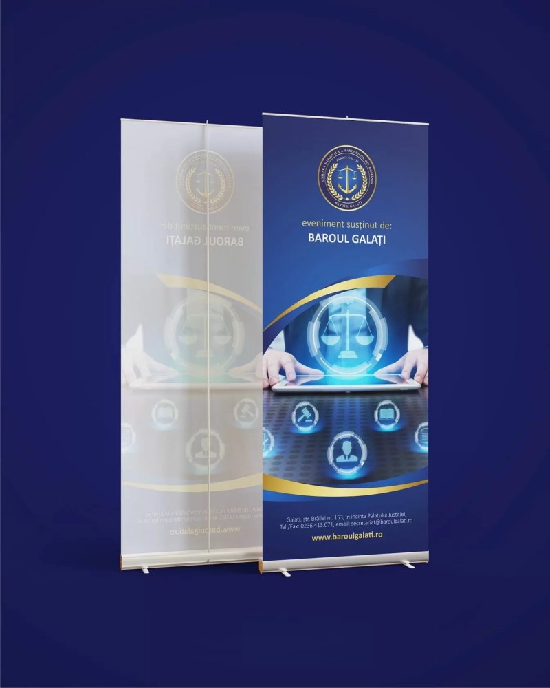 The specifically chosen colours—profound dark blue paired with sumptuous golden tones—powerfully convey commanding authority and peerless professionalism, subsequently consolidating the public image of the Galați Bar Association. The logo adapts with magnificent ease to diverse mediums, ranging seamlessly from printed documents, such as elegant letterheads, premium folders, and pristine business cards, to cutting-edge digital materials and highly visible promotional assets, including majestic roll-ups and official activity reports. Thus, the entire visual identity is beautifully completed by bespoke elements that ensure absolute coherence and immediate recognition in absolutely any context.
