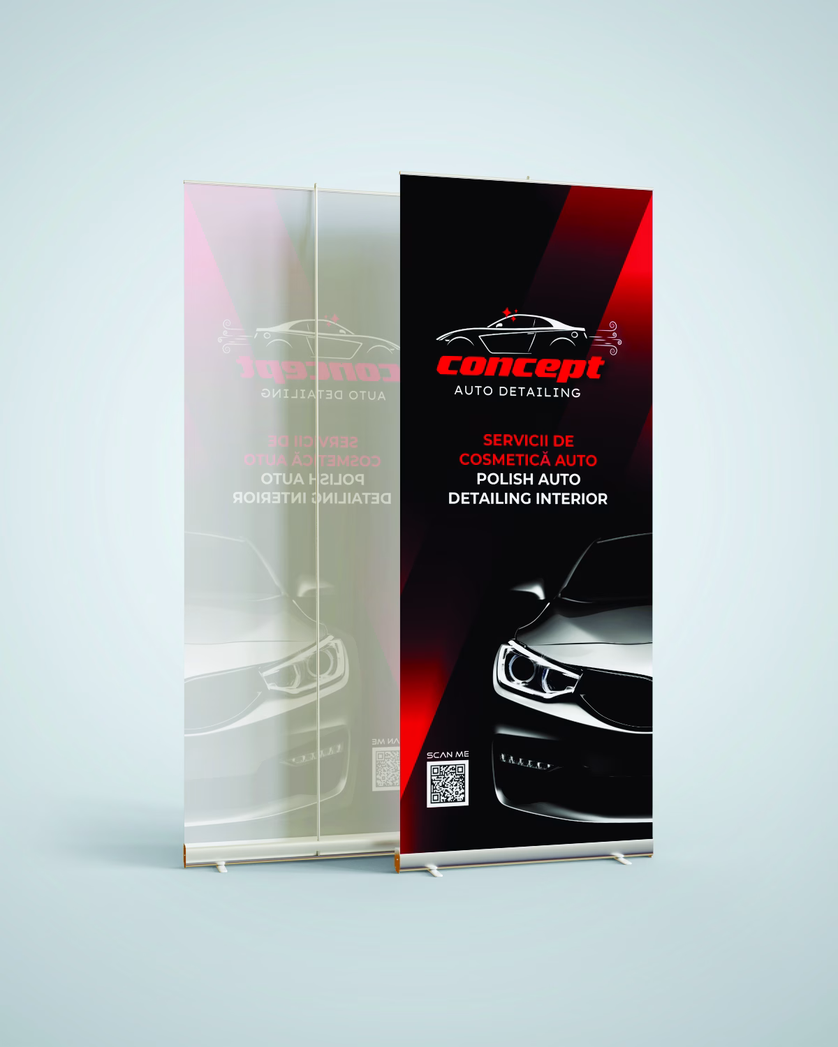 The impeccably crafted communication materials—ranging magnificently from exquisite business cards and captivating flyers to monumental, striking roll-ups—were deliberately conceived as perfect, organic extensions of the overarching brand. Every single stunning element masterfully conveys a formidably strong, boldly modern, and thoroughly quality-oriented personality, successfully underpinning the breathtaking attention to detail that inextricably defines the elite services at Concept Auto Detailing.