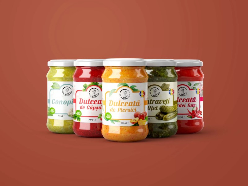 Within the spectacular design specifically crafted for the exquisite "De la soacra mea" (From My Mother-in-Law) labels, we resolutely, phenomenally opted for an absolutely gorgeous vintage style steeped profoundly in exquisite, classic elegance in order to powerfully and unequivocally accentuate the remarkably strong traditional and brilliantly artisanal character. We masterfully employed stunningly vibrant, remarkably fresh colours to spectacularly highlight the staggering diversity inherent across the myriad exquisite assortments, flawlessly complemented by breathtakingly realistic, gorgeously evocative illustrations of the specific, magnificent fruits intrinsically defining absolutely every single delectable assortment of phenomenal jam.