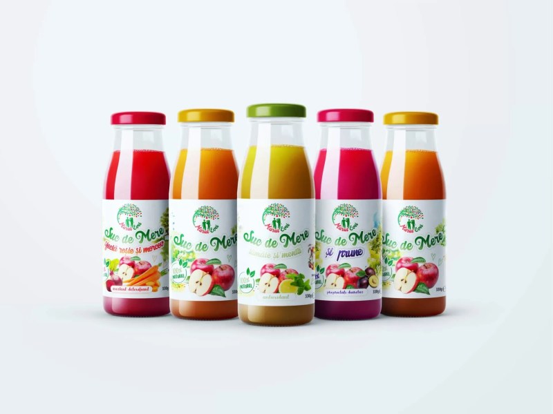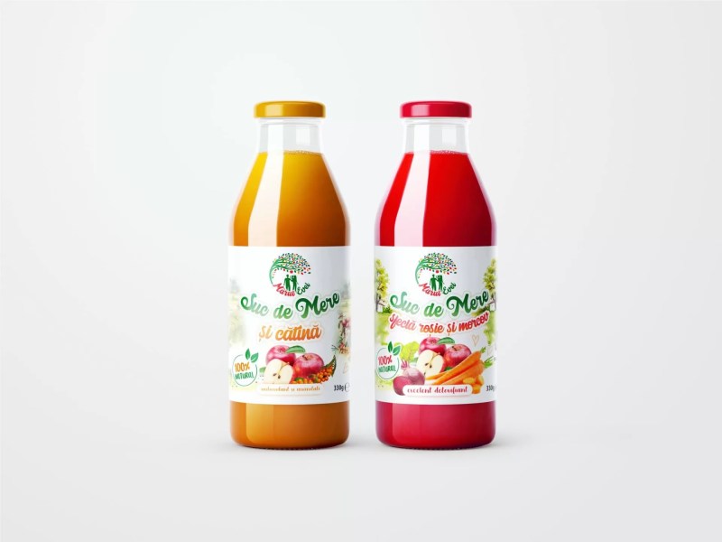 “Mărul Evei” este un brand local ce propune publicului sortimente de sucuri naturale ce au ca prim ingredient mărul. Etichetele de produs au un design simplu, dar eficient, reflectând calitatea și gustul proaspăt al produselor. Am folosit nuanțe de verde deschis și alb pentru a sugera naturalețe și prospețime, urmărind o grafică simplă și curată. Logo-ul "Mărul Evei" strălucește în partea superioară, iar numele produsului este prezentat într-un font jucăuș și prietenos, cu culori care se potrivesc cu fructele folosite ca si ingrediente. Ilustrațiile clare aduc un aspect proaspăt și autentic, în timp ce paleta de culori este vie și plină de energie, reflectând diversitatea fructelor și a ingredientelor naturale.