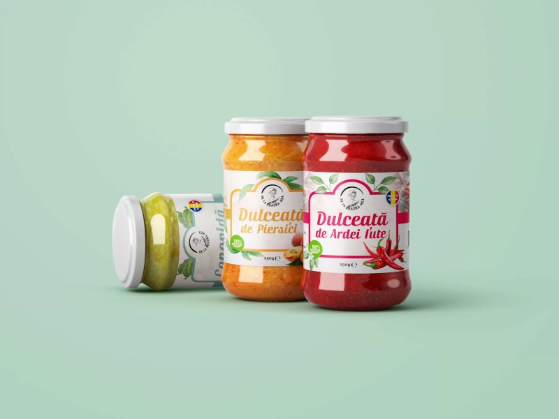 O secțiune bine structurată care prezintă sortimentul specific și ingredientele folosite este delimitată clar, alături de detalii despre proveniența fructelor și procesul de fabricație. Ne-am dorit ca acest design să reflecte calitatea și diversitatea sortimentelor de dulceață, îmbinând aspectul elegant cu informații utile pentru consumatori.