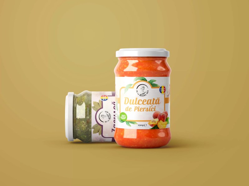 În designul etichetelor "De la soacra mea" am optat pentru un stil vintage de eleganță clasică pentru a accentua caracterul tradițional și artizanal, culori vibrante și proaspete pentru a evidenția diversitatea sortimentelor, ilustrații realiste ale fructelor specifice fiecărui sortiment de dulceață.