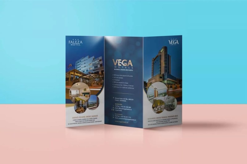 Folosit ca punct de plecare pentru identitatea creată, logo-ul Vega Hotels reunește spiritul celor două hoteluri, Vega și Faleza - parte din același consorțiu, iar reprezentarea sa exprimă spiritul acestor clădiri elegante, poziționate în mod privilegiat pe cursul Dunării. Culoarea bleumarin - elegantă și sobră - subliniază legătura hotelurilor cu vechiul fluviu, iar elementul argintiu, punctează fluiditatea. Acest element exprimă și flexibilitatea companiei de a se adapta la nevoile în continuă schimbare a clienților săi. Sloganul care însoțeste logo-ul în materialele de comunicare - Business, leisure & events - face trimitere la principalele servicii oferite de cele două hoteluri.